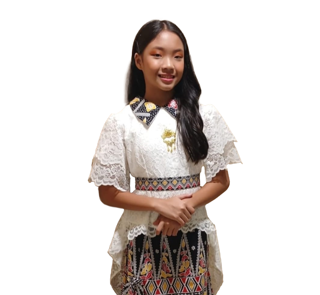 Blouse Hitam dengan Kain Tenun Baduy Kuning Motif Poleng dengan Benang Hijau dan Merah.